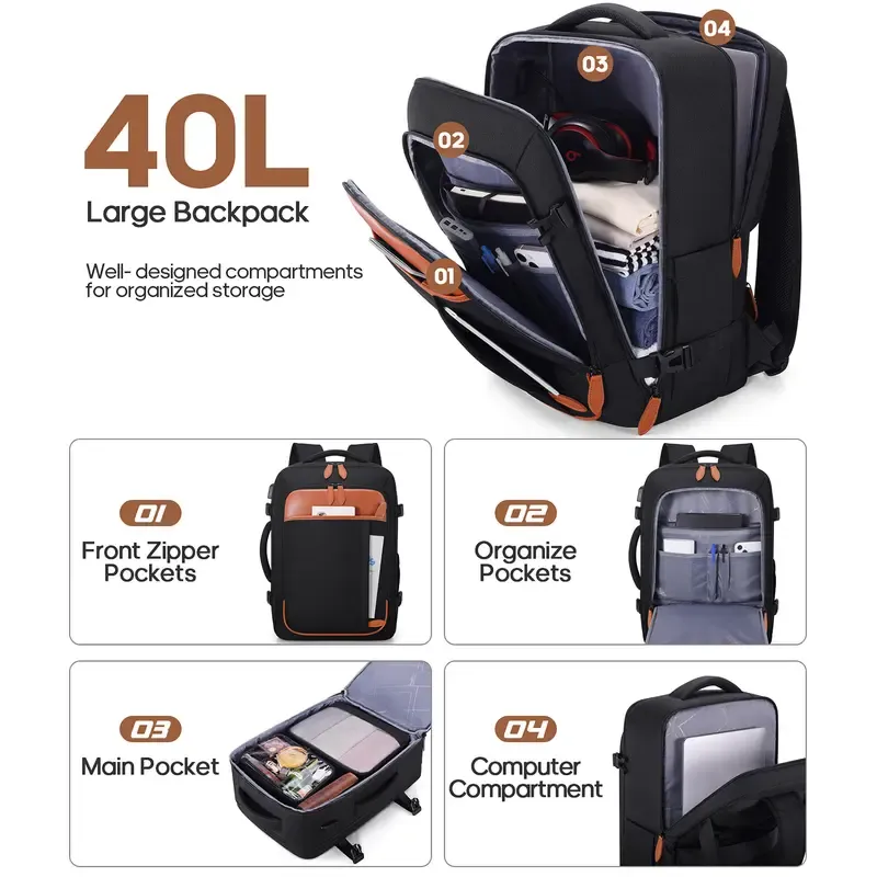 🧳 Large & Organized Up to 40L capacity with multiple compartments: