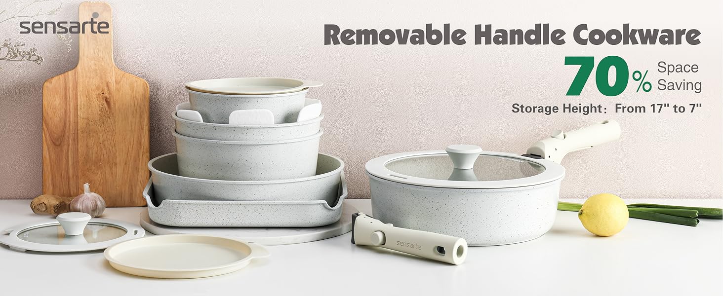 SENSARTE 17 Piece Pots and Pans Set, Nonstick Detachable Handle Cookware Set, Induction Kitchen Cookware Set with Removable Handle, Healthy Non Stick for RV, Dishwasher �?Oven Safe, PFOA Free (White)